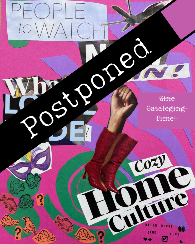 We’re postponing our scheduled zine cataloging time.